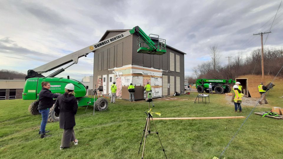 Envelope and mechanical system prototypes for the retrofit solution were developed and fabricated by project partners Cocoon Construct and tkFabricate. The prototypes were tested using Syracuse University’s Building Energy and Environmental Systems Laboratory (BEESL) and the Building Envelope Systems Test (BEST) facility, under the leadership of Professor Jianshun Zhang and Dr. Rui Zhang at Syracuse University’s College of Engineering and Computer Science. VIP Structures provided valuable industry feedback on the installation process, including time- and labor-tracking. A team of faculty and students from the School of Architecture, coordinated by Professors Bess Krietemeyer and Amber Bartosh, developed a digital component database and design protocol for the retrofit solution using low-to-middle income residences operated by the Syracuse Housing Authority as the basis of design.