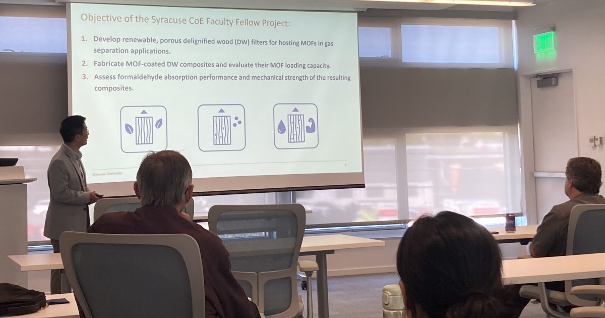 Wang presented the results of his Faculty Fellow research project, which explored the use of delignified wood as a scaffold to hos metal-organic framework (MOF) particles. MOFs have emerged as highly tunable and efficient materials for gas separation, but their practical deployment is limited by scalability and structural fragility.